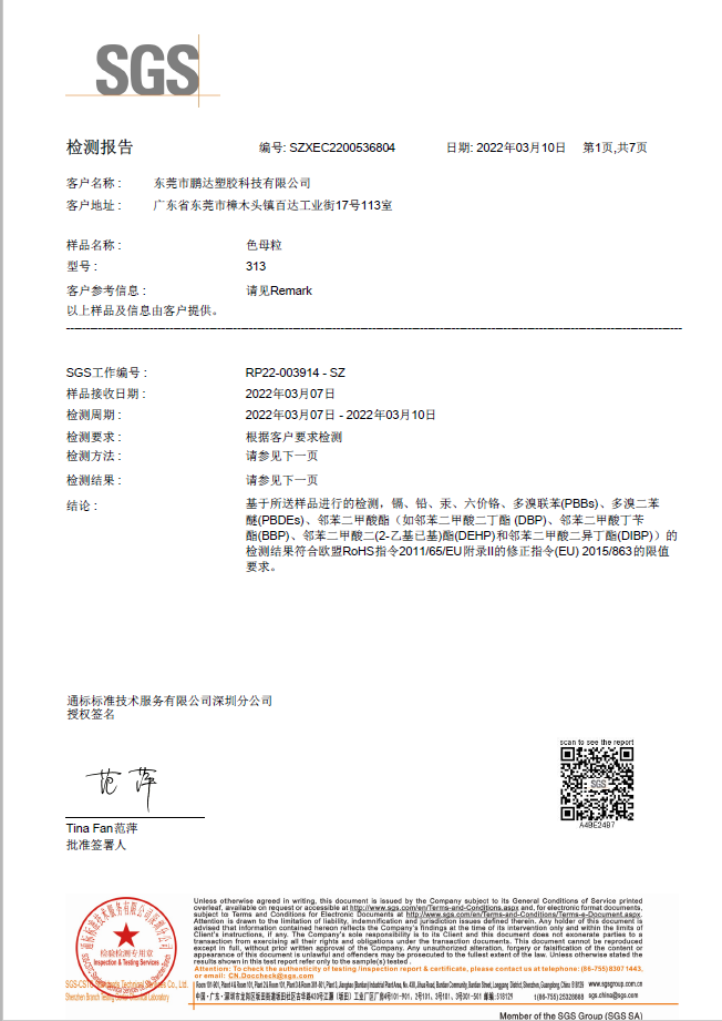 和鵬達(dá)塑膠科技有限公司合作很長(zhǎng)一段時(shí)間了,他們的產(chǎn)品質(zhì)量好,服務(wù)到位,且原材料都通過SGS測(cè)試符合歐盟REACH,PaHS、ROHS及無鹵指令,備有美國(guó)FDA級(jí)食品接觸規(guī)格物料,和他們合作完全沒有后顧之憂!
